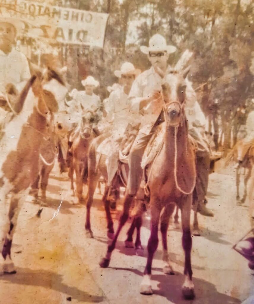 Un nutrido grupo de ganaderos cotaxtlecos, acudió a una cabalgata al puerto de Veracruz el 20 de marzo de 1964, para atender la visita del licenciado Gustavo Díaz Ordaz, candidato a la presidencia de la República; el grupo fue comandado por Domingo Morales Peña, quien posa en primer plano, criador de caballos de carreras, nacido en la comunidad de Mecayucan y con residencia en El Bosque.