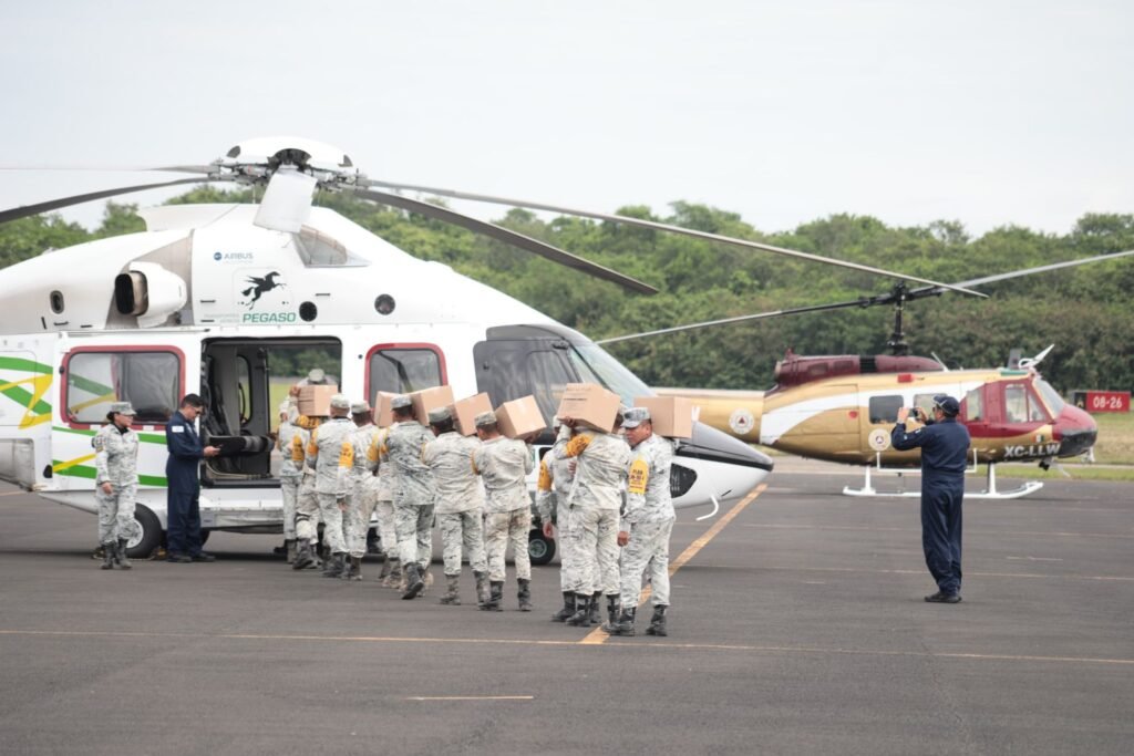 Poza Rica, Ver., lunes 13 de octubre de 2025.- En seguimiento a las acciones de atención y auxilio a la población afectada por las lluvias provocadas por la vaguada y la depresión tropical 90E, la gobernadora Rocío Nahle García informó que este lunes se establecieron cinco rutas aéreas de apoyo humanitario hacia comunidades incomunicadas, mediante un esfuerzo conjunto de los tres órdenes de gobierno.