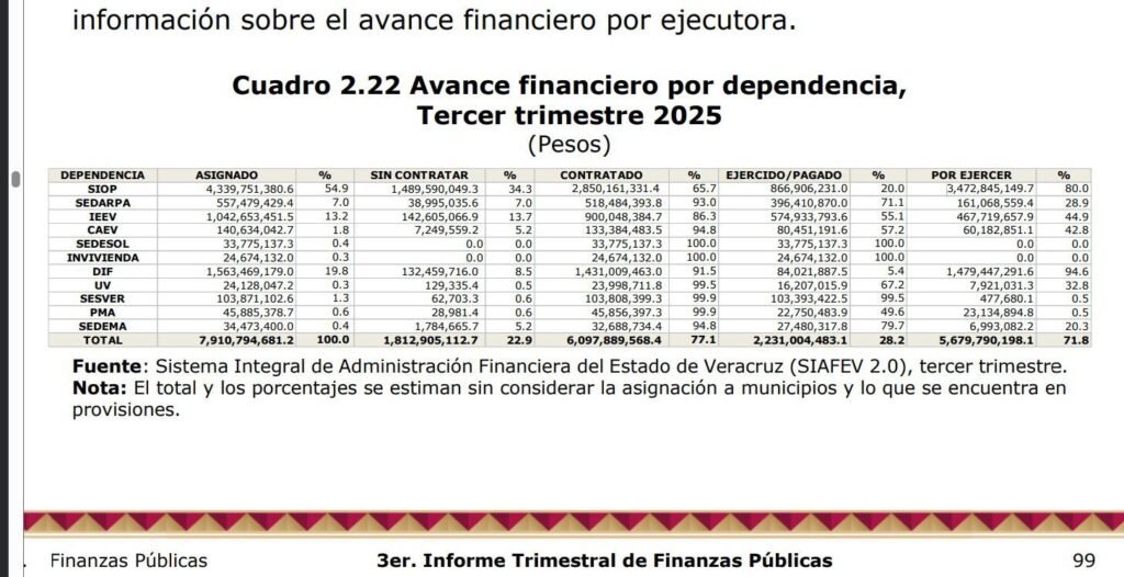 El rezago es documentado en el Cuadro “Avance financiero por dependencia” del Tercer Informe Trimestral del Gasto Público Enero – Septiembre 2025.