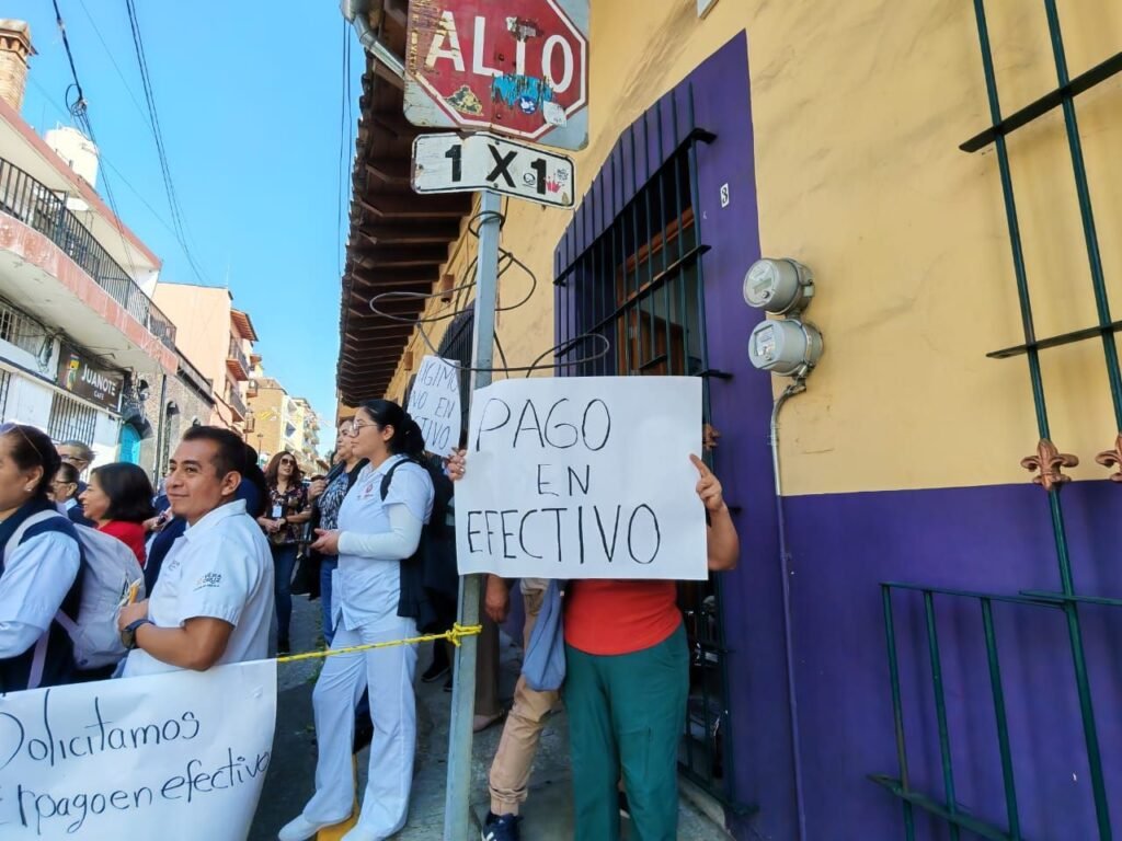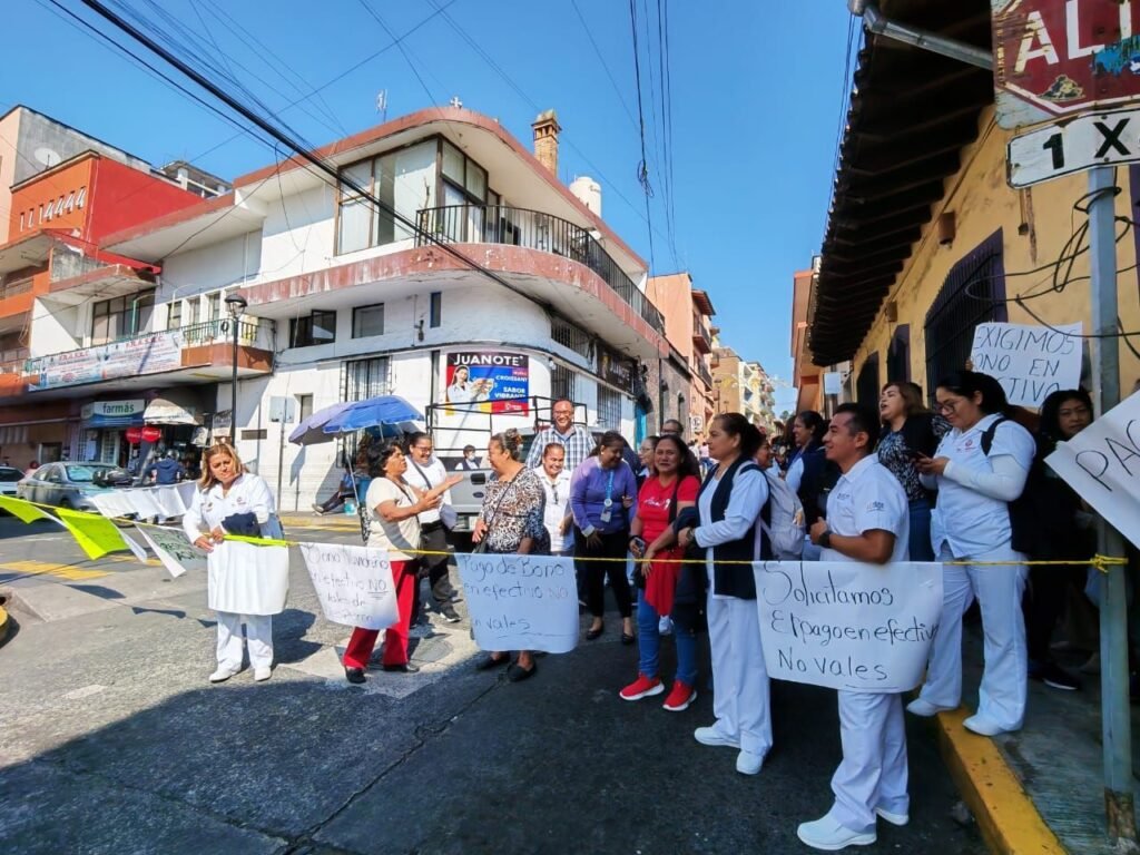Xalapa, Ver., Trabajadores de la Secretaría de Salud, del hospital regional “Dr. Luis F. Nachón”, bloquearon nuevamente la calle Nicolás Bravo, a la altura del nosocomio, en protesta por el pago que la dependencia les hizo con una tarjeta que sólo pueden hacer efectiva supuestamente para víveres.