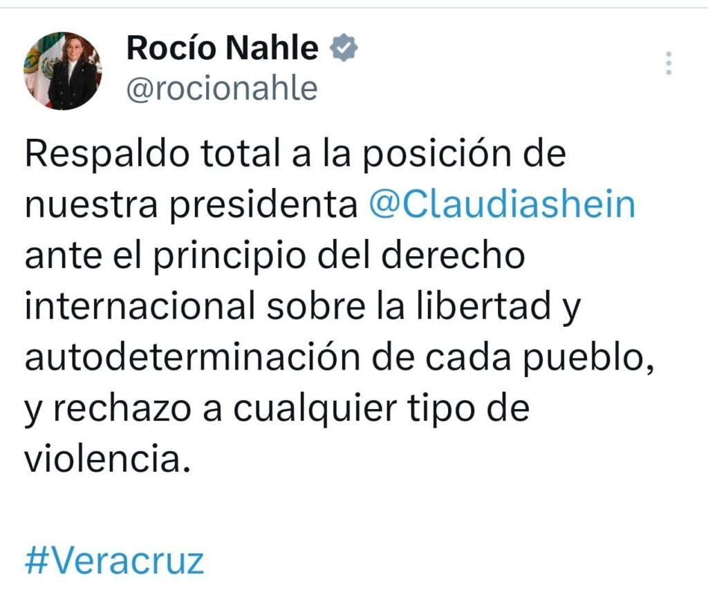 Xalapa, Ver., La gobernadora de Veracruz, Rocío Nahle García dio su respaldo total a la posición de la presidenta Claudia Sheinbaum Pardo, quien condenó la intervención militar de Estados Unidos en Venezuela.