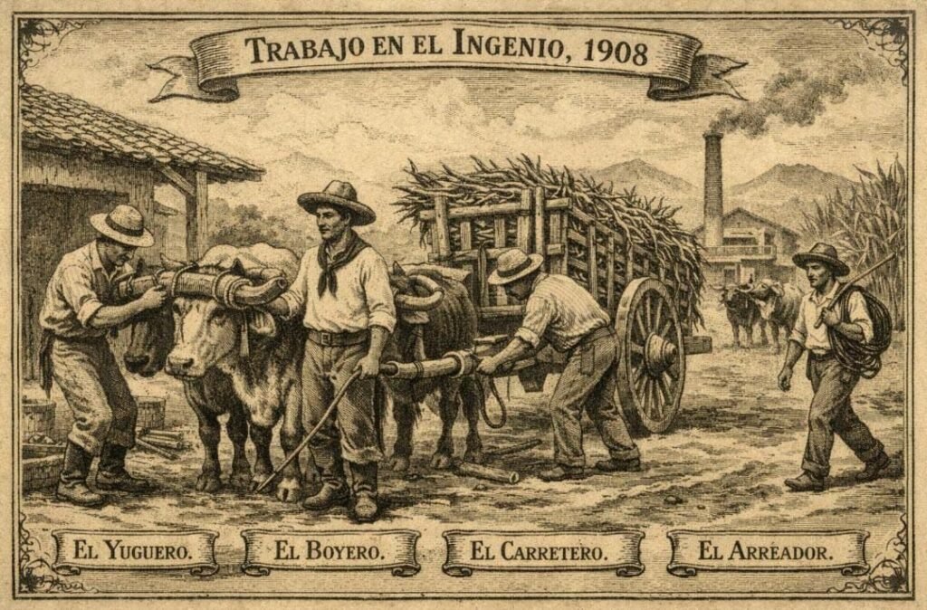 Bueyeros, Yugueros, carretoneros, narigoneros, caballerangos, gañanes, jefes de campo y cortadores de caña se alistan para llevar a los campos cañeros las carretas jaladas por dos bueyes, para que lleven la caña al ingenio o a los cargadores que había en lo diferentes campos.